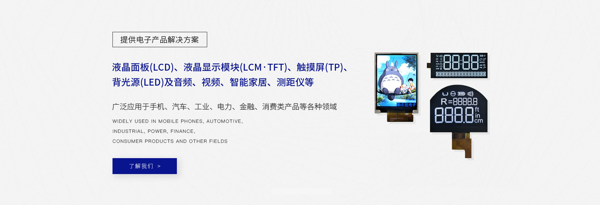 專業(yè)設計、生產(chǎn)液晶面板(LCD)、液晶顯示模塊(LCM·TFT)、觸摸屏(TP)、背光源(LED)及音頻、視頻、智能家居、測距儀等